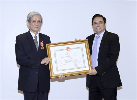 | Le chef de la Commission de l'organisation du PCV, Pham Minh Chinh (droite), remet l'Ordre de l'indépendance à l'ancien directeur général de la VNA, Hô Tiên Nghi, le 29 mars à Hanoi. |