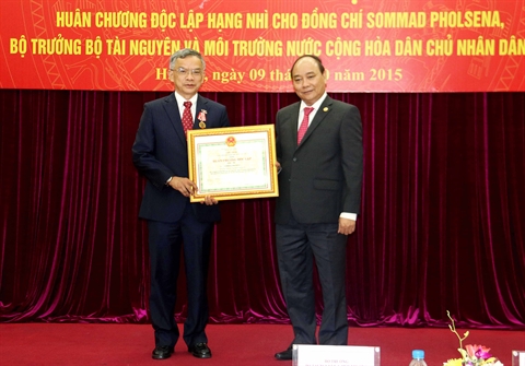 | Nguyên Xuân Phuc (droite) remet le 9 octobre à Hanoi l’Ordre de l’Indépendance de 2e classe à Sommad Pholsena. |