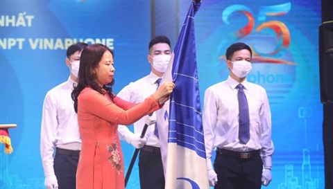| La vice-présidente de la République, Vo Thi Anh Xuân, lors de la cérémonie de remise de l’Ordre du Travail de première classe à VNPT-VinaPhone. |