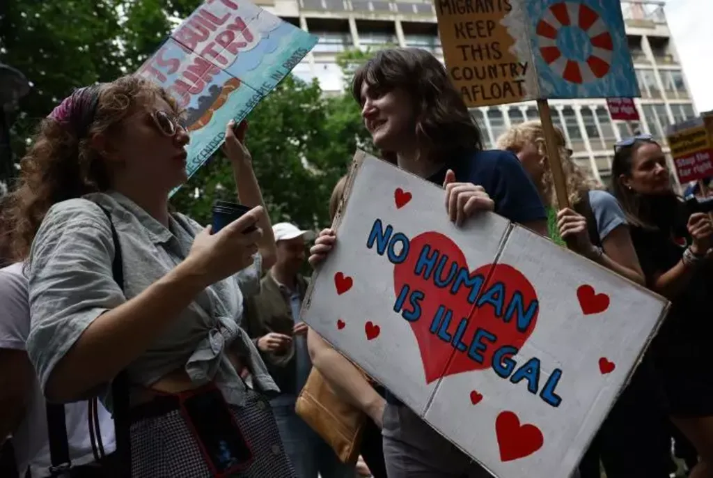 | Manifestation antiraciste à Londres devant le siège du Parti d'extrême droite Reform UK, le 10 août. |