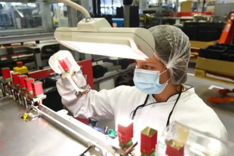 | Une employée de la société L'Oréal contrôle la qualité de cosmétiques sur une chaîne de production à Lassigny, dans le Nord de la France, le 6 octobre 2021. |