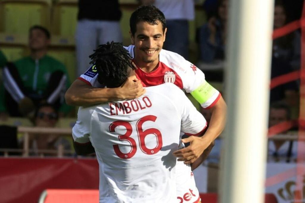 | Wissam Ben Yedder félicité par son coéquipier Breel Embolo après l'un de ses trois buts contre Nantes, le 2 octobre au stade Louis II. |