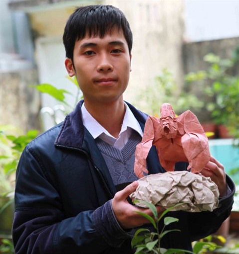 | L’origamiste vietnamien Nguyên Hùng Cuong et son œuvre "Gorilla". |