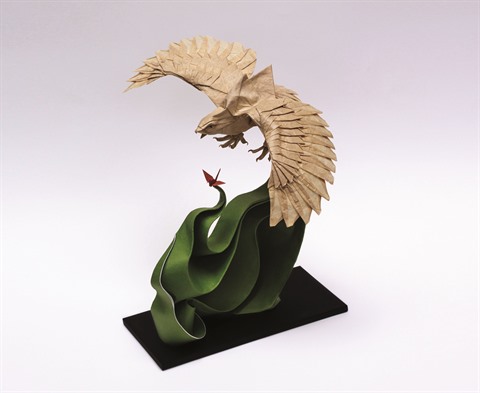 Comme le veut la tradition, Hùng Cuong utilise du papier dó (confectionné à partir de l’écorce de Rhamnoneuron) pour ses créations. La plupart sont pliées chacune uniquement sur une feuille carrée, sans découpes ni collages. "J’admire vraiment le talent et le dévouement de Hùng Cuong. Nous lui avons donné des dessins 2D, puis nous avons reçu ses créations très vivantes, transmettant des valeurs fortes sur l’environnement", commente Pham Hông Ngoc, responsable de l’exposition Loài Plastic.