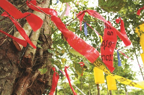 | Des rubans suspendus par des visiteurs afin de prier pour la chance. |