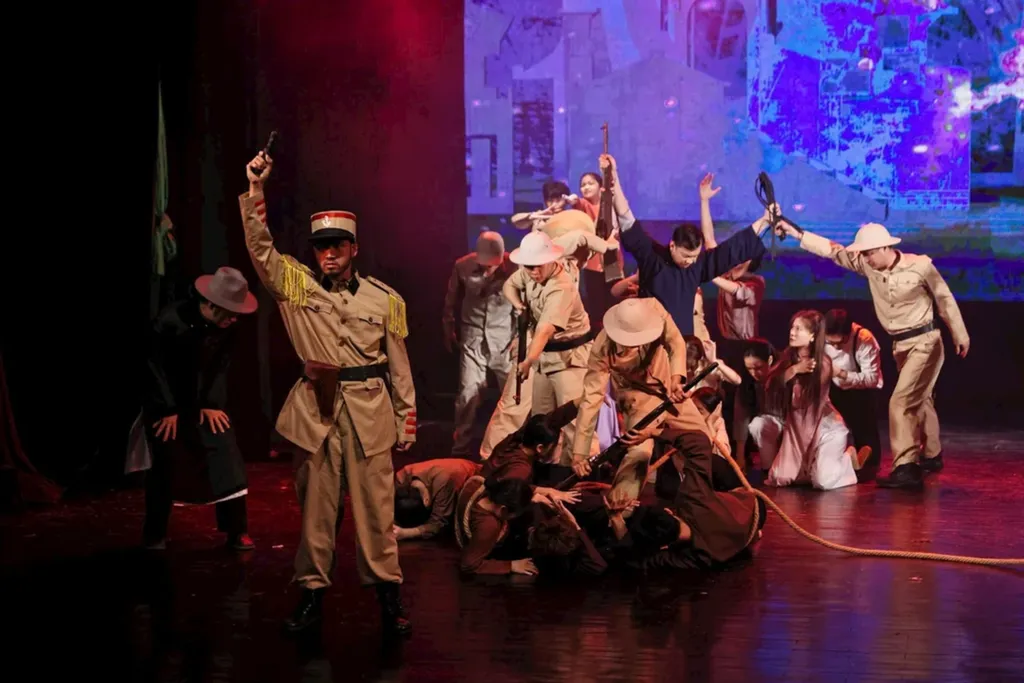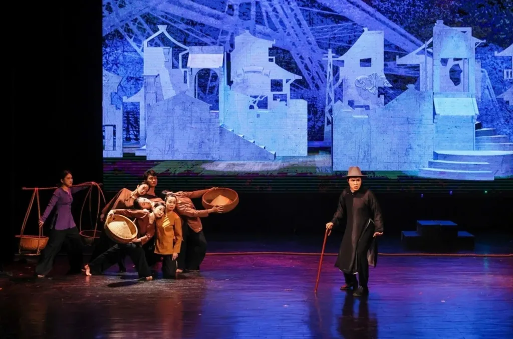 | Une scène dans la pièce "Lửa từ Đất" réunissant des artistes hanoïens. |
