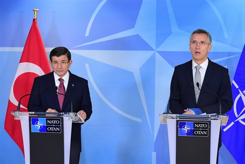 | Ahmet Davutoglu (gauche) et Jens Stoltenberg, le 30 novembre à Bruxelles. |