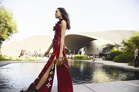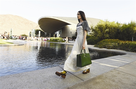 | Un mannequin présente un modèle de la nouvelle collection Louis Vuitton, le 6 mai à Palm Springs en Californie. |