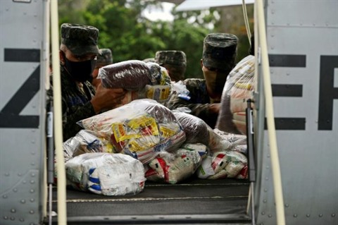 | Des membres des avions cargo de l'armée de l'air du Honduras avec des provisions pour les résidents de la ville de Puerto Lempira, dans le département de Gracia a Dios, devant la Ligue Eta Hurricane, le 2 novembre à Tegucigalpa. |