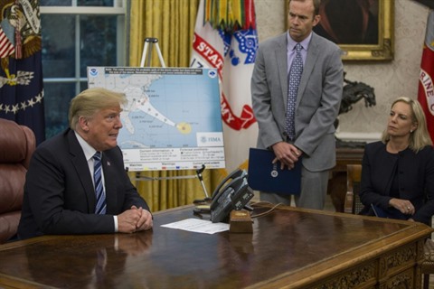 Le président Donald Trump (gauche) reçoit un briefing dans le Bureau ovale sur l'ouragan Florence, le 11 septembre.
