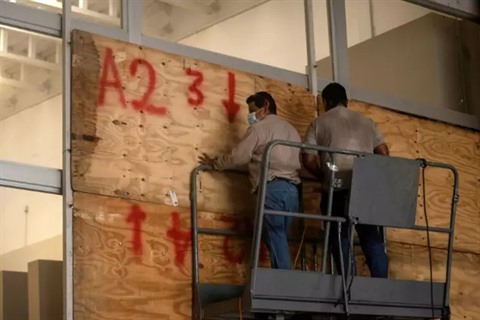 | Des panneaux de bois sont installés sur les fenêtres d'un supermarché pour éviter les dégâts lors du passage de l'ouragan Grace à Boca del Rio (Mexique) le 20 août. |