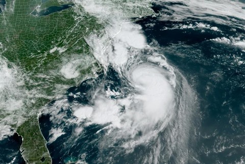 | Image satellite le 21 août à 15h00 GMT de l'ouragan Henri, avant son arrivée sur les côtes du Nord-Est des États-Unis |
