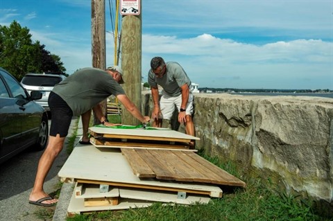 | Deux membres d'une association de plage privée démontent une cahute de plage en prévision du passage de l'ouragan Henri, à New London (Connecticut), le 21 août. |