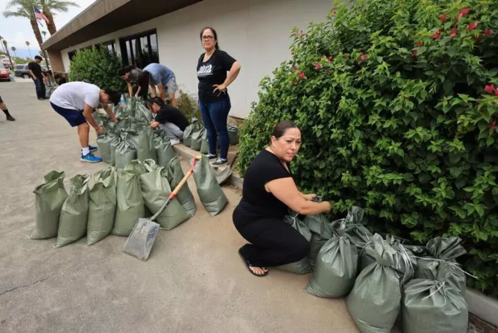 | Des habitants d'Indio, dans l'État américain de Californie, préparent des sacs de sable en prévision du passage de l'ouragan Hilary, le 19 août. |