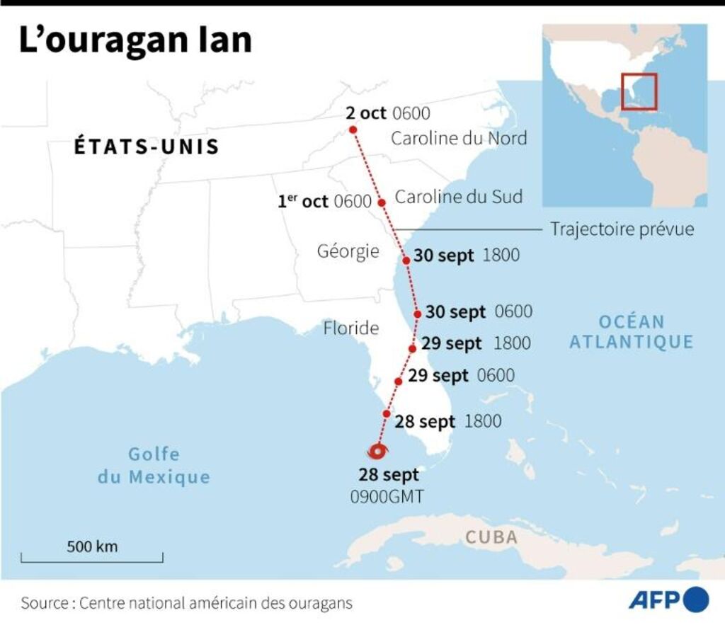 | Carte montrant la trajectoire prévue de l'ouragan Ian, qui doit toucher terre en Floride. |