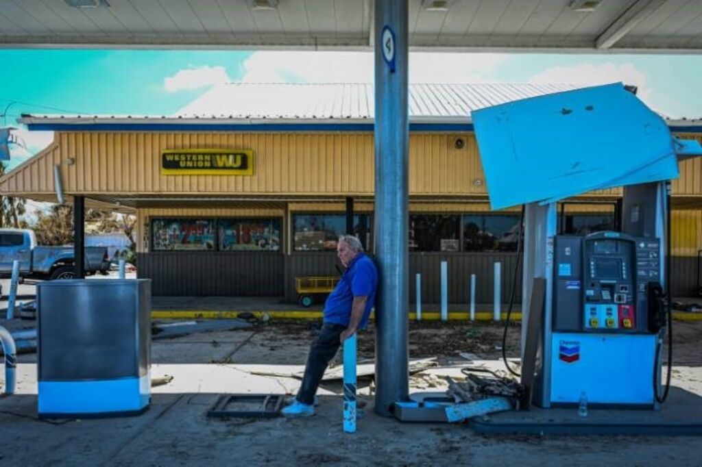 | Un habitant de l'île San Carlos à Fort Myers, en Floride, s'adosse le 1er octobre à un pylone d'une station-service endommagée après le passage de l'ouragan Ian. |
