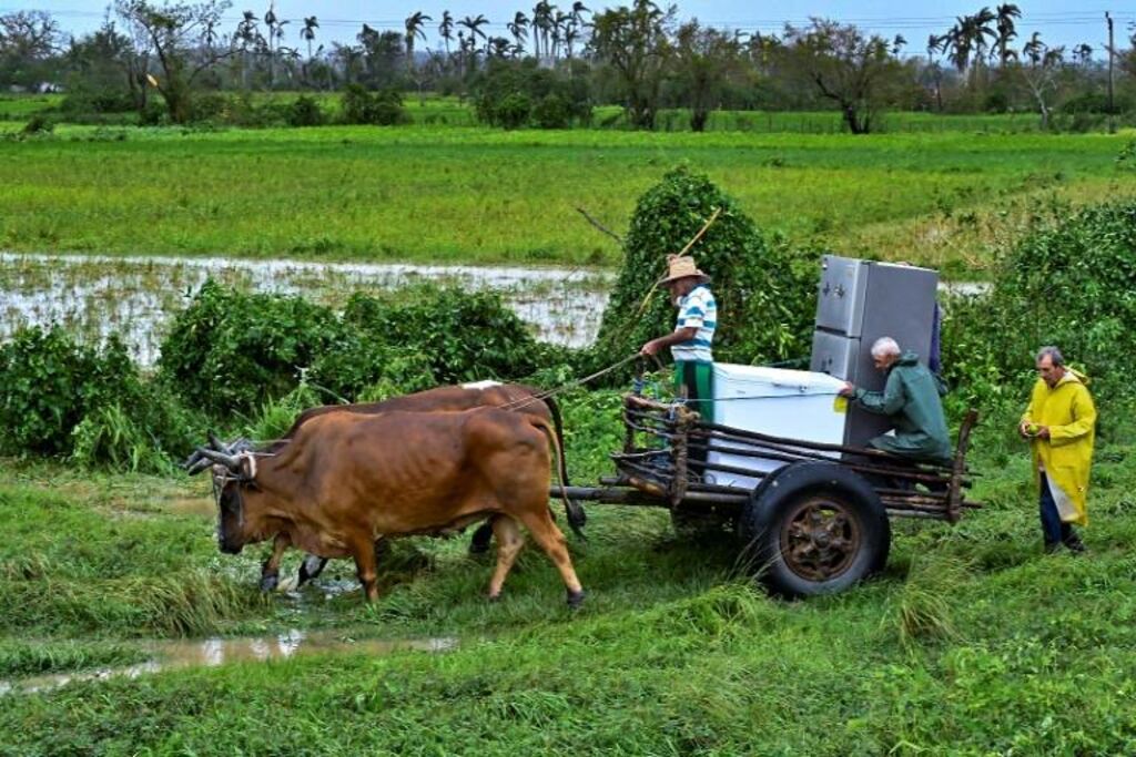 | Des Cubains transportent des effets personnels dans une charrette à travers les champs inondés à San Juan y Martinez, province de Pinar del Rio, le 27 septembre, après le passage de l'ouragan Ian. |