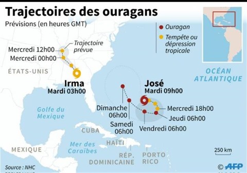 Dans les Caraïbes, le président français Emmanuel Macron a visité l'île franco-néerlandaise de Saint-Martin, l'une des plus durement frappées par Irma, où s'est également rendu le roi des Pays-Bas, Willem-Alexander.