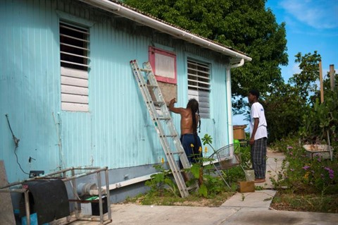| Des habitants de Marigot, sur l'île de Saint-Martin, protègent leur maison avant l'arrivée de l'ouragan Irma. |