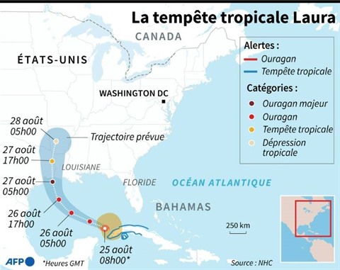 | Carte montrant la trajectoire prévue de la tempête tropicale Laura, qui doit atteindre la force d'un ouragan alors qu'elle se dirige vers les côtes américaines. |