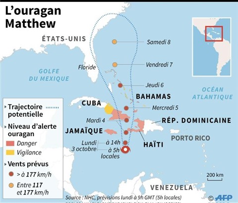 "Selon les prévisions, le centre de Matthew s'approchera de la côte Sud-Ouest d'Haïti ce soir, continuera à s'approcher de l'est de Cuba plus tard mardi 4 octobre, avant de passer près ou au-dessus de certaines portions du sud-est des Bahamas mardi soir 4 octobre et mercredi 5 octobre", a prédit le centre américain de surveillance des ouragans (NHC), basé à Miami.