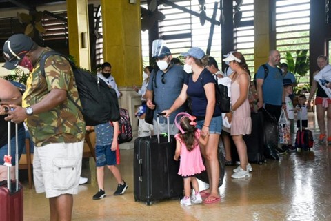 | Des touristes sont évacués de Puerto Morelos, avant l'arrivée de l'ouragan Delta, le 6 octobre au Mexique. |
