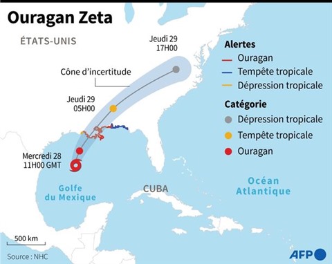 | Localisation et trajectoire prévue de l'ouragan Zeta qui atteindra les côtes de la Louisiane le 28 octobre. |
