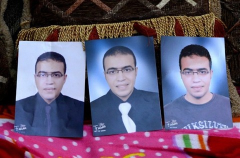 | Photo prise le 5 février au Caire de différents portraits d'Abdallah El-Hamahmy, un Égyptien soupçonné d'être l'auteur de l'attaque à la machette contre des militaires au musée du Louvre à Paris. |