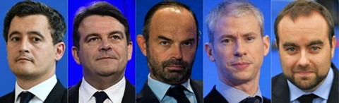 | De gauche à droite : Gérald Darmarin, Thierry Solère, Edouard Philippe, Franck Riester et Sébastien Lecornu. |