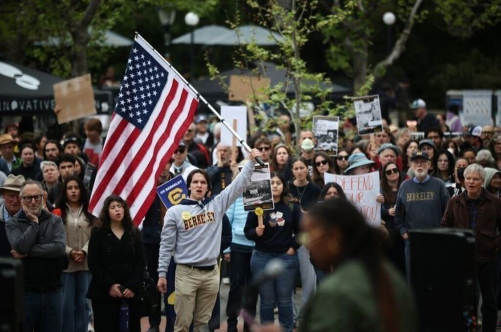 | Marche de protestation contre l’ingérence du gouvernement fédéral dans le secteur de l’enseignement supérieur à l’université de Berkeley, en Californie (États-Unis), le 17 avril. |