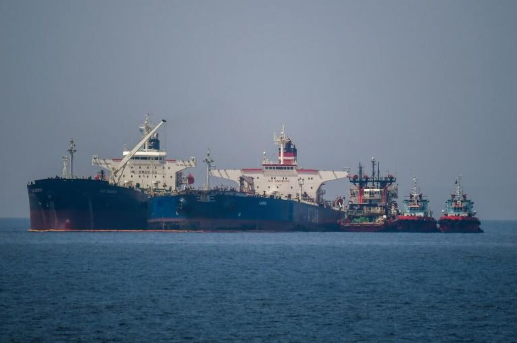| Deux pétroliers se transfèrent une cargaison d'hydrocarbures au large de l'île grecque d'Eubée, le 29 mai. |