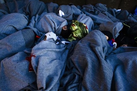 | Des migrants endormis sous des couvertures sur le rivage de l'île de Lesbos le 15 octobre en provenance de Turquie. |