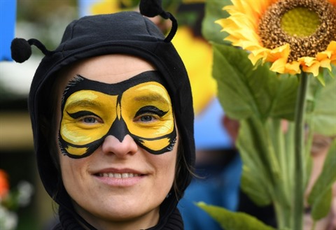 | Déguisée en abeille, une manifestante appelle parmi des centaines d'autres à l'arrêt de pesticides dangereux pour les abeilles, à Bruxelles le 27 avril. |