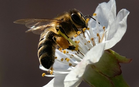 | Une abeille recueille le pollen d'une fleur de cerisier dans un jardin aux alentours de Moscou, le 22 mai 2017. |