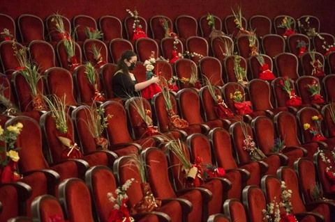 | Une employée de l'Opéra de Sofia dispose de fleurs artificielles sur les sièges qui resteront vacants, avant la représentation de "La Traviata", le 18 février |