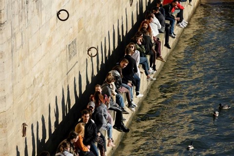| Sur les quais de Seine à Paris, lors d'un dimanche ensoleillé malgré la pandémie de COVID-19, le 28 février |