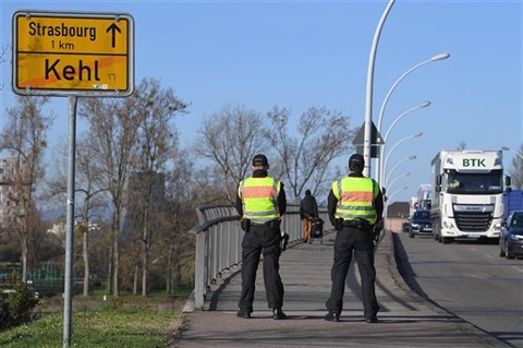 | Deux policiers allemands montent la garde à la à la frontière franco-allemande, le 16 mars 2020. |
