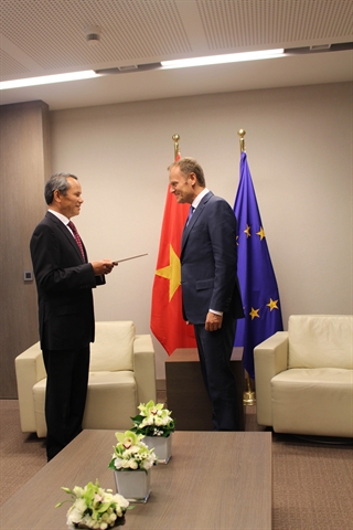 | L’ambassadeur Vuong Thua Phong (gauche) présente au président du Conseil européen Donald Tusk les lettres de créance du président vietnamien Truong Tân Sang. |