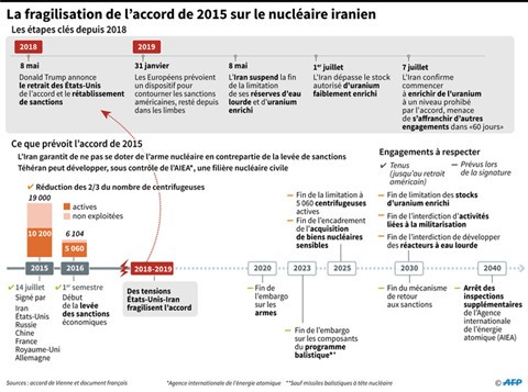| Les principaux points prévus dans l'accord sur le nucléaire iranien et les dates clés depuis l'annonce du retrait américain en mai 2018. |