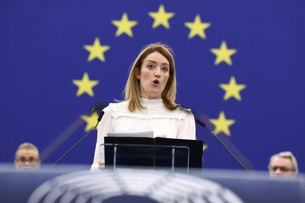 | La présidente du Parlement européen Roberta Metsola s'exprime lors d'une plénière à Strasbourg le 16 janvier 2024. |