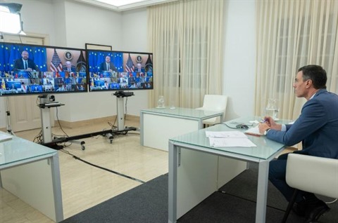 | Le Premier ministre espagnol Pedro Sanchez suit depuis Madrid l'intervention du président américain Joe Biden lors d'un sommet virtuel de l'UE le 25 mars. |