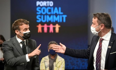 | Le président français Emmanuel Macron (gauche) et le Premier ministre luxembourgeois, Xavier Bettel lors d'un atelier du Sommet social européen à Porto, au Portugal, le 7 mai. |