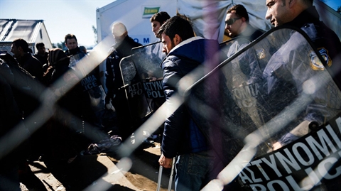 | Des migrants à la frontière entre la Grèce et la Macédoine près de Gevgelija le 21 avril. |
