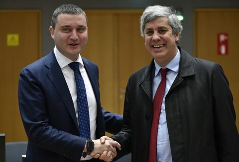 | Le ministre bulgare des Finances, Vladislav Goranov (gauche) et son homologue portugais et président de l'Eurogroupe, Mario Centeno à Bruxelles, le 23 janvier. |
