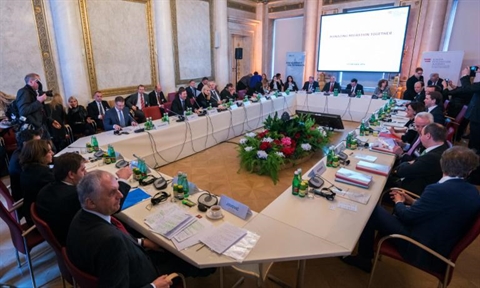 | Les ministres des Affaires étrangères de Bosnie-Herzegovine, Dragan Mektic, (gauche) et autrichien, Sebastian Kurz, le 24 février à Vienne. |