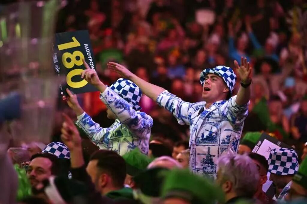 | Des supporteurs costumés, lors de la finale du championnat du monde de fléchettes, à l'Alexandra Palace de Londres, le 3 janvier 2025. |