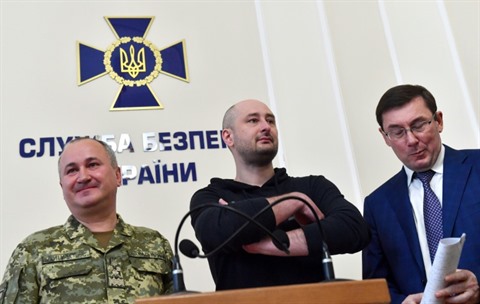 | Le journaliste russe Arkadi Babtchenko (centre) aux côtés du chef des services ukrainiens de sécurité (SBU) Vassyl Grytsak (droite), pendant une conférence de presse à Kiev, le 30 mai. |