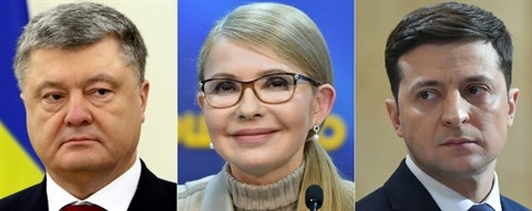 | Trois candidats à la présidentielle en Ukraine (de gauche à droite): le président Petro Poroshenko, l'ex-Première ministre Ioulia Timochenko, et le comédien Volodymyr Zelensky. |