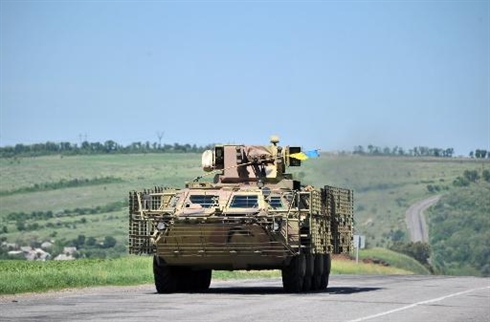 | Un blindé ukrainien sur la route entre Izyum et Slavyansk, le 21 mai. |