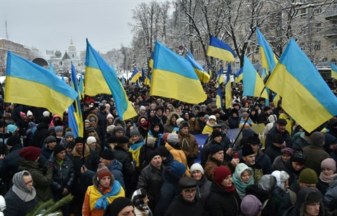 | Des manifestants à Kiev devant la cathédrale Sainte-Sophie avant l'ouverture d'un concile historique pour créer une Église ukrainienne indépendante, le 15 décembre 2018. |